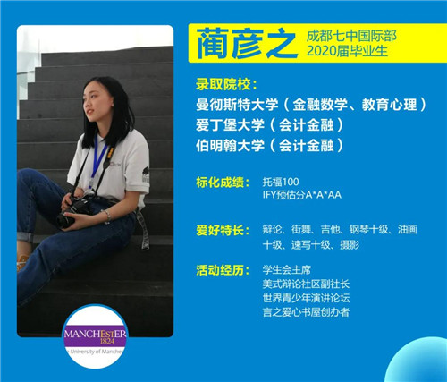 在七中国际部的三年,让我平凡的学习生活变得不平凡的是学校的各项活动。活动的参与和领导力的培养也是七中国际部的一大亮点。我曾在校担任学生会主席一职。在每年的万圣节及圣诞晚会等大型活动中,我们学生会都发挥了重要的作用。学生会的同学们也经常积极组织开展校内外的各项学生活动,比如说去山区支教和看望老人。我也非常热爱美式辩论,曾在成都七中国际部担任美式辩论社区副社长。让我感受最深的是高中三年里与辩论社团成员在北京、重庆、厦门等地参加比赛。美辩比赛最开始是一种活动,但越加深入地学习美辩让我渐渐的爱上了美辩事业。