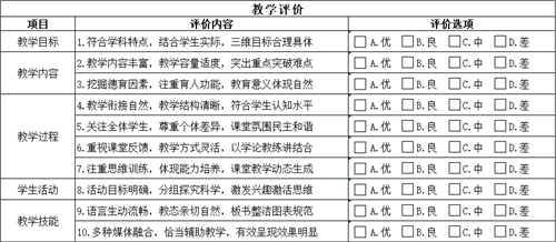 公开课结束后,听课老师则根据教学目标、教学内容、教学过程、学生活动、教学技能5个项目共10个维度进行评价并给出建议。并且这样的教学评价体系和成都七中普高完全一致。