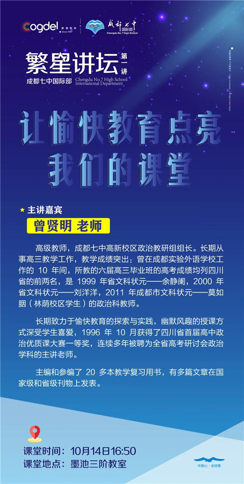 繁星讲坛,群星璀璨。“繁星讲坛”第一讲,将由成都七中高新校区政治教研组组长曾贤明老师带来分享《让愉快教育点亮我们的课堂》。欢迎各位老师莅临倾听,也希望更多老师走上讲坛分享你们的故事~