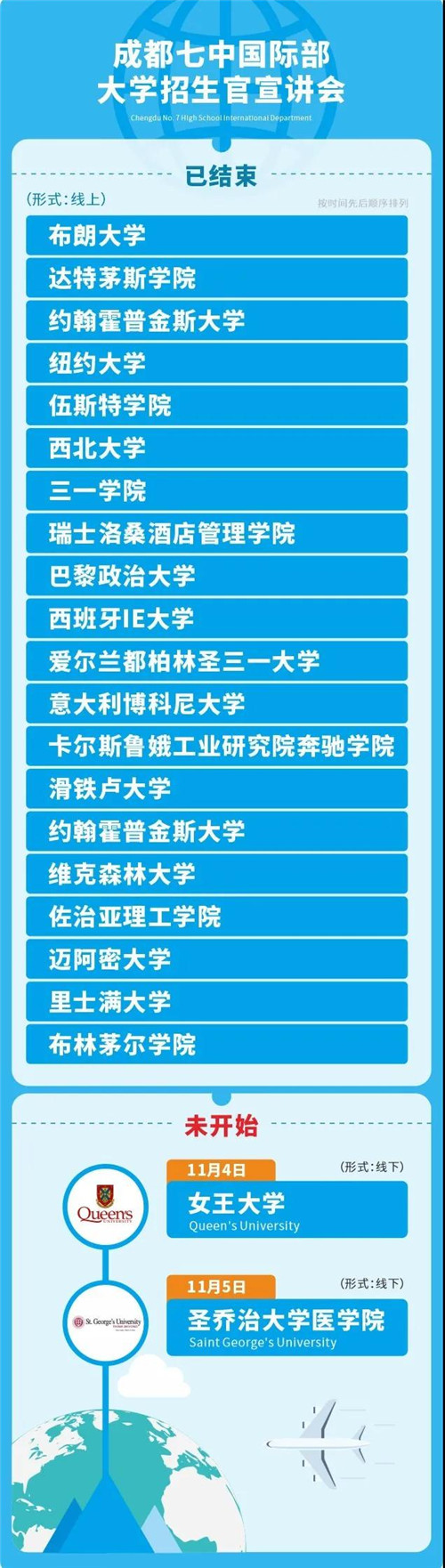 自3月份以来,成都七中国际部的同学们也通过网络实时参与了多场大学招生官线上宣讲会,这些大学来自美国、加拿大、瑞士、西班牙、爱尔兰、意大利等国家,其中既有美国常春藤院校、TOP30综合性大学,也有文理学院、理工学院以及其他专业院校。