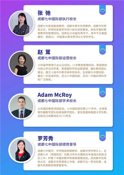在成都七中国际部,校级行政班子由四位经验丰富的中外籍老师分别担任执行校长、运营校长、学术校长和德育督导。本次校长见面会,国际部四大中外校长将联袂出席,以座谈会的形式,让大家了解成都七中国际部如何在学术教育、品格培养、领导力及创新能力培养等全人教育方面,为学生成长发展做好全面准备。