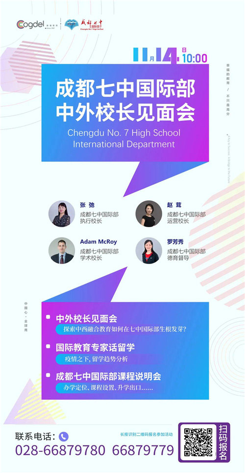 成都七中国际部将于2020年11月14日重磅开启中外校长见面会,届时从成都七中林荫到国际部,现任成都七中国际部执行校长的张弛校长将首次带领成都七中国际部校级行政班子和 国际教育专家国际教育专家邹宏宇,从探索中西教育如何融合和疫情之下留学趋势分析两个方面为大家全面解析新时代的国际教育精髓,为学生成长发展做好全面准备。