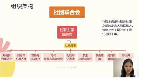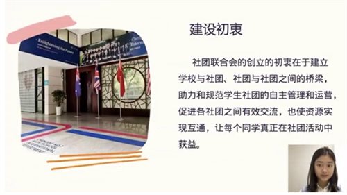 “我们七中国际部是一个社团活动特别丰富的地方,但是社团与社团之间缺少沟通的桥梁,所以,社团联合会就应运而生了。”社联主席高三黄韵霏同学分享道。