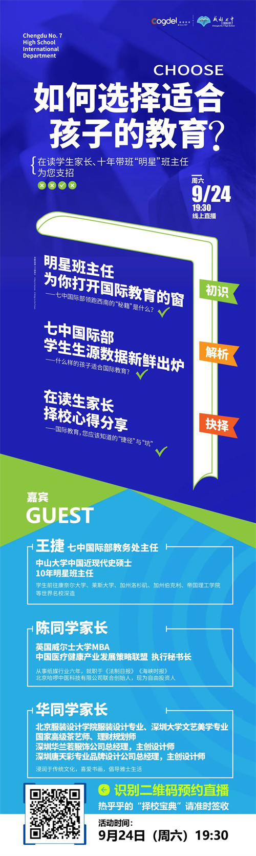 9月24日(周六)19:30,七中国际部新学期首场分享会《如何选择适合孩子的教育?》,在读学生家长、十年带班“明星”班主任和你一起探讨孩子成长话题。欢迎家长朋友们扫描下方二维码预约,咨询电话:028-66879779、66879780、66879781