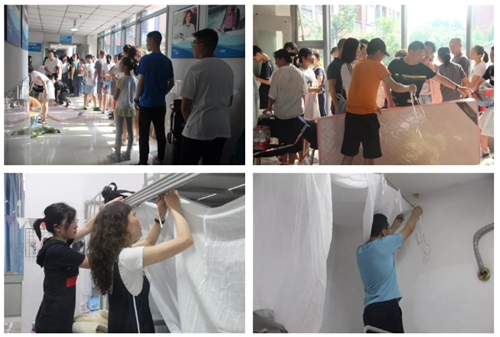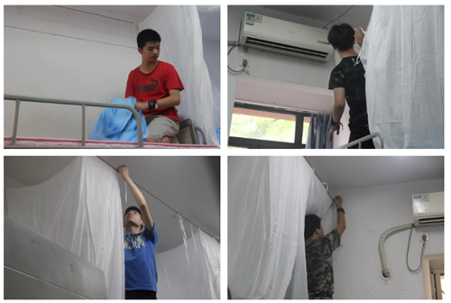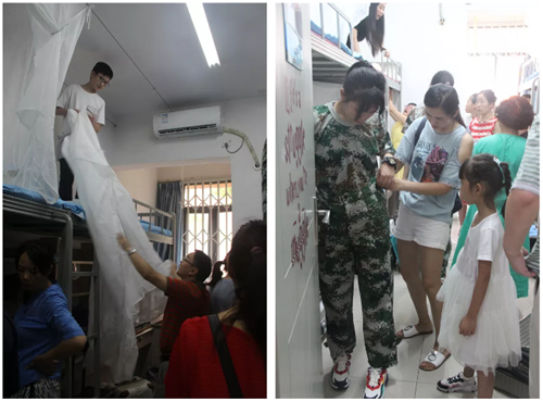 上午10点,温度已经攀升到了30℃,汗水打湿了头发,衣服上也出现了一幅幅不规整的“黑地图",这时候的寝室门口正热火朝天的分发寝具。爸爸妈妈帮忙把高处的蚊帐挂好,孩子则一边收拾行李整理桌柜,一边聆听着父母的叮嘱“要学会照顾自己”“要和同学好好相处互相帮助”。