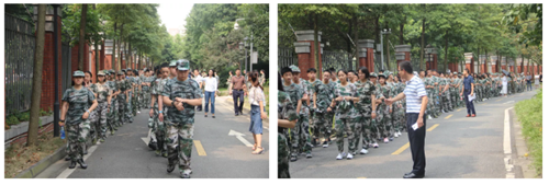 10:30,同学们已经换好迷彩服,在墨池书院一楼的各个教室里等待军训的号角吹响。当然,正式开始前,我们的班主任也进行了动员大会,为新生讲述军训的意义以及时间安排。