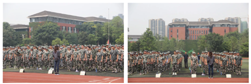 11点,全校新生不畏酷热,在操场列队整齐,参加了军训开营仪式。