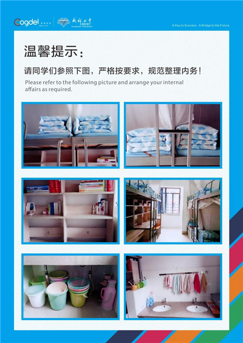 在国际部,老师们不仅在教育教学上严格要求学生,在内务整理上也绝不放松要求。在寝室门口贴有这样的提示图,时刻提醒同学们以高标准整理自己的内务。
