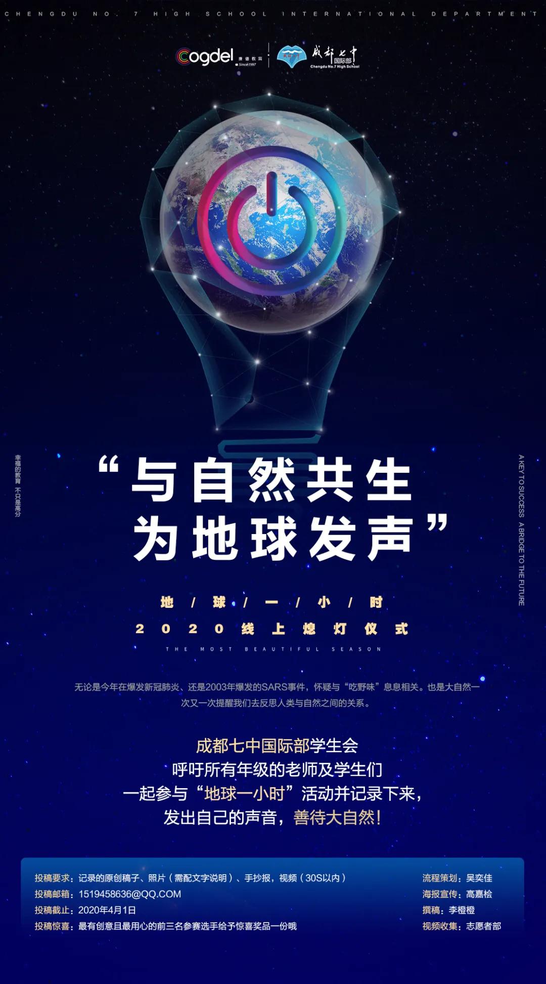 世界自然基金会(WWF)发起的地球一小时活动,从2007年起迅速覆盖全球,具有广泛的公众号召力。每年3月成为了环保月,每年的地球一小时活动,都是世界性的全民自发参与的环保盛会,表达全球对于共同抵御气候变暖行动的支持。而今年的3月28日,就是“地球一小时”的统一活动时间,活动主题为”与自然共生“,呼吁公众关注生物多样性保护,同时为地球发声,将公众的环保主张传递出来。与全球的环保者们一起关掉电灯和不必要电器,为环保事业做出看似简单却不可或缺的贡献,同时为疫情的抗击送上来自成都七中国际部的祝福。