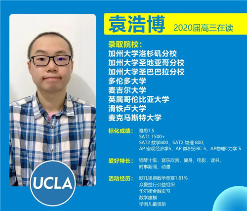 每年的毕业生中,我们不乏跨国别申请多所院校的优秀学子。今天要说的这位同学,袁浩博,就是跨国别申请,不仅获得美国TOP20加州大学洛杉矶分校录取,加拿大多伦多大学、麦吉尔大学、英属哥伦比亚大学这些顶级名校也纷纷递来橄榄枝。如果只是拿到录取还不足为奇,了解这位同学的申请经历后,相信大家都会被惊到。