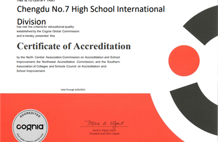从开始接洽到获得认证用时不到4个月, 从开始走流程到获得认证用时不到1个月, 2023年1月26日,成都七中国际部通过Cognia终审,正式成为Cognia认证学校。
