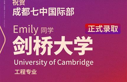 喜讯!A-Level全球夏季统考成绩近日相继放榜,成都七中国际部再传捷报!早在2025年初就已获得剑桥大学工程专业预录取的Emily同学,凭借优异的实考成绩,成功将这份珍贵的Offer转正为无条件正式录取!