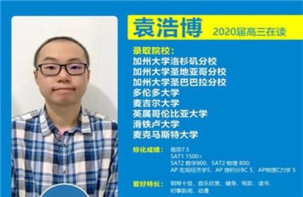 袁浩博高二下学期才从普高转到国际部,算起来,在国际部只有1.5年时间,这段期间,他需要适应国际部英文授课模式,准备标化考试,参加课外活动,为大学申请做准备。听起来时间紧,任务重,要想兼顾所有还要获得好成绩是有一定难度的。