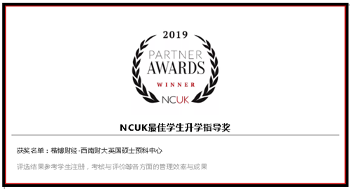除了以上两个重磅奖项,康德教育集团下属楷博财经教育与西南财经大学合作成立的楷博财经-西南财大英国硕士预科中心也荣获NCUK最佳学生升学指导奖。