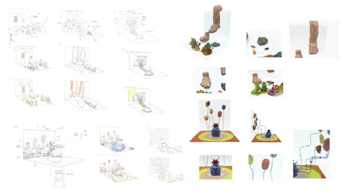 这是个3D装置项目,主要讲的是不同的诱惑。左边是一些sketches,包括最后确定的草稿和之前的一些小实验,右边是最后的成品图。