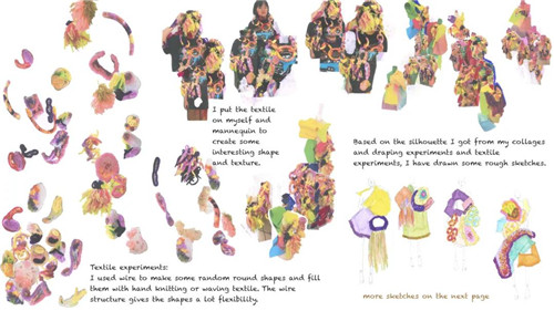 这张展示的是我的一个服装项目中间的一个过程。前面做了调研过后就会开始做面料改造。这个过程手工量很大,会很累很费时间,但是这是一个好作品的基础。面改过后还会在人台上做实验,最后才画出效果图。