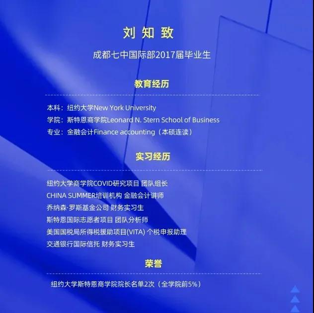 纽约是全美经济、金融、教育的中心,商科则是美国高等教育的代表和留学申请的热门。在纽约学商科,学生们既能享受一流的教育资源,又能获得一流的就业机会,因此这里的商学院一向是申请者眼中的“香饽饽”。今天为大家做分享的校友刘知致,目前正在纽约顶级商学院-斯特恩商学院进行金融会计专业的硕士学习(本硕连读)。他也是成都七中国际部美辩社的创始人之一,曾获得美式辩论赛西南地区冠军。