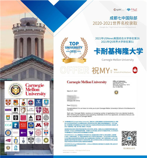 2021重磅录取 、当地时间3月27日,世界知名大学卡耐基梅隆大学发布招生录取通知,成都七中国际部2位学子分别获得卡耐基梅隆大学建筑学院和工程学院录取!