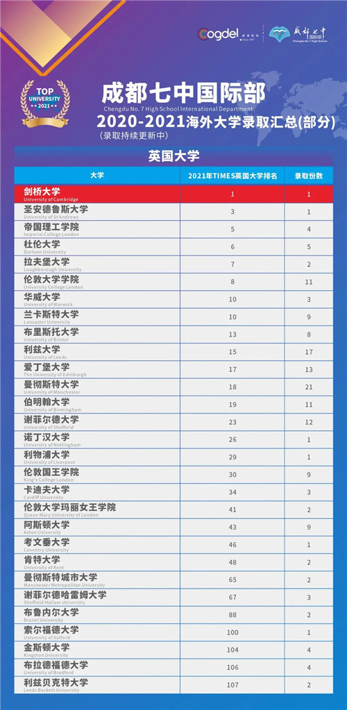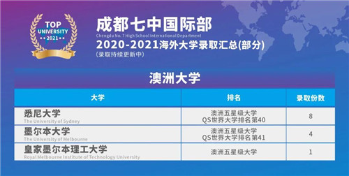 感谢成都七中国际部全体中外教及升学老师的辛勤付出! 我们定将不负众望,再接再厉,让七中国际部学子在世界舞台上闪耀!与此同时,让我们一起静候佳音,期待更多重磅喜讯的到来!未来我们还将发布2021完整录取结果并带来更加详细的解读。
