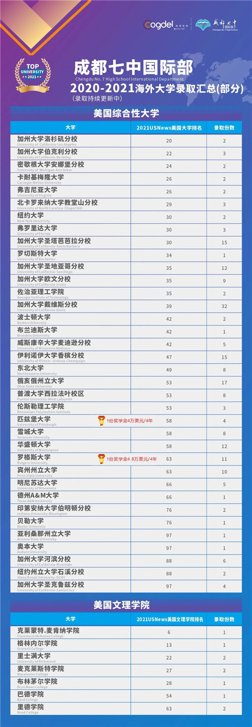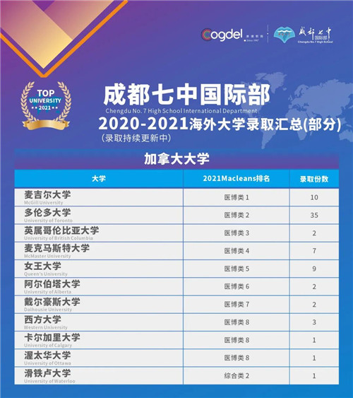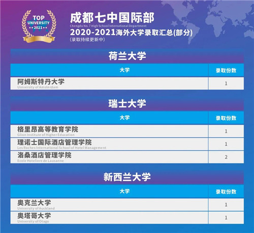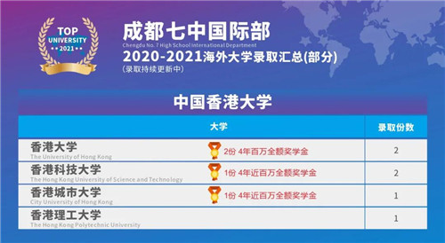 截至目前,成都七中国际部2021届高三AP、A-level、IFY 以及成都七中(林荫)国际课程班的同学已收获来自英美澳加瑞等国家的世界名校OFFER共计500+份,如英国G5超级精英大学-剑桥大学、帝国理工学院、伦敦大学学院,美国TOP30名校加州大学洛杉矶分校、密歇根大学安娜堡分校、弗吉尼亚大学、纽约大学,顶尖文理学院-克莱蒙特•麦肯纳学院,“设计界的哈佛”-罗德岛艺术设计学院,澳洲八大墨尔本大学,加拿大医博类TOP1麦吉尔大学,世界第一所酒店管理学院-瑞士洛桑酒店管理学院,阿姆斯特丹大学、香港大学(全额奖学金录取)等世界顶尖大学,其中多位同学拿到了大学发放的丰厚奖学金。