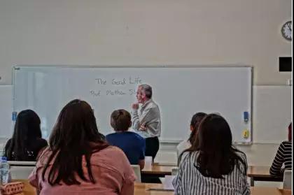 接下来的环节是sample class,我被分配到一堂哲学课。教授在黑板上写下今天的话题The Good Life,与大家探讨什么是好的人生。黑板上很快被写满了代表“好的人生”的要素:金钱,自由,平衡,独立,自信,成就,目标,知识,人际关系......教授又让大家思考哪些要素是基础的,而非依赖于别的要素而存在的。比如金钱就不是基础要素,是金钱换来的东西带给我们自信或是自由。关于这个问题同学们产生了分歧,每一位同学都积极地阐述自己的观点,教授与他们不断互动,启发大家循序渐进地思考。当这堂课结束,思考并没有结束。这不仅仅是一门课程或是一个话题,而是让每一个参与者都能不断反思,通过不同文化的碰撞了解别人的观点,从而拥有更开阔的视野和胸怀。
