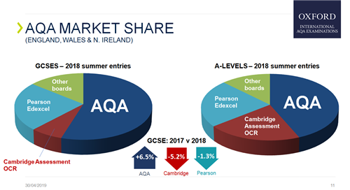 AQA考试局是英国本土大的考试局,也是英国新课程与考试改革标准的领衔制定者,有超过一半的英国学生用AQA考试局的课程与成绩申请学校。2015年,牛津大学出版社与AQA考试局联合组建了牛津AQA国际考试局。来自JCQ发布的英格兰市场份额数据显示:2018年在英国,AQA科学考量常年稳居第一,超过43.5%的A-level考生、近70,000名A-Level考生选择AQA科学考试。