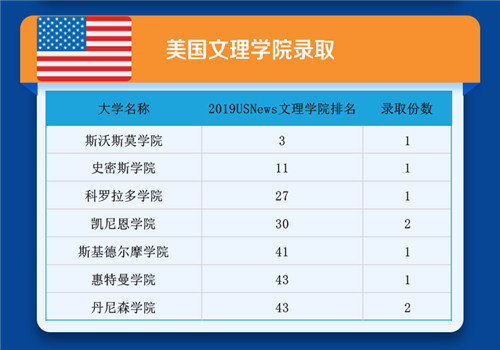 申请美国大学的学子中,81%进入美国TOP50名校!其中4%进入TOP20名校,20%进入TOP21-30名校,57%进入TOP31-50名校;包含排名TOP20的范德堡大学,圣路易斯华盛顿大学,斯沃斯莫尔学院等
