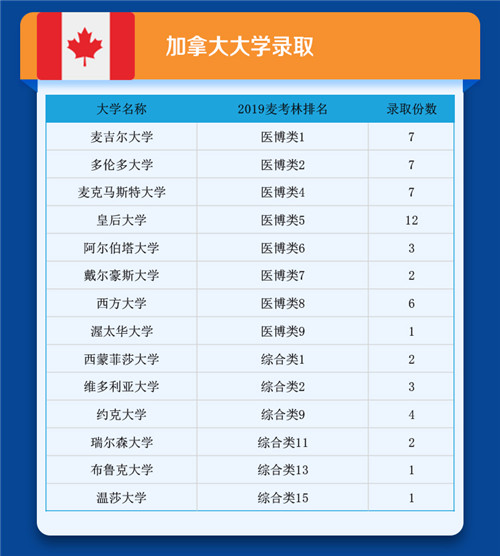 申请加拿大大学的学生中,100%进入TOP5名校!包含医博类TOP1麦吉尔大学7份录取,麦克马斯特大学,皇后大学,维多利亚大学等