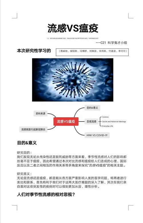 假期期间,成都七中国际部学子在保证正常的学习进度之外,还积极参与了一场线上“抗疫”挑战赛,和来自全国多个省市的学生共300余人同台学习、竞技。同学们经过1个月左右的学习,在老师的指导下,完成了一篇题为《流感VS瘟疫》的高质量论文。