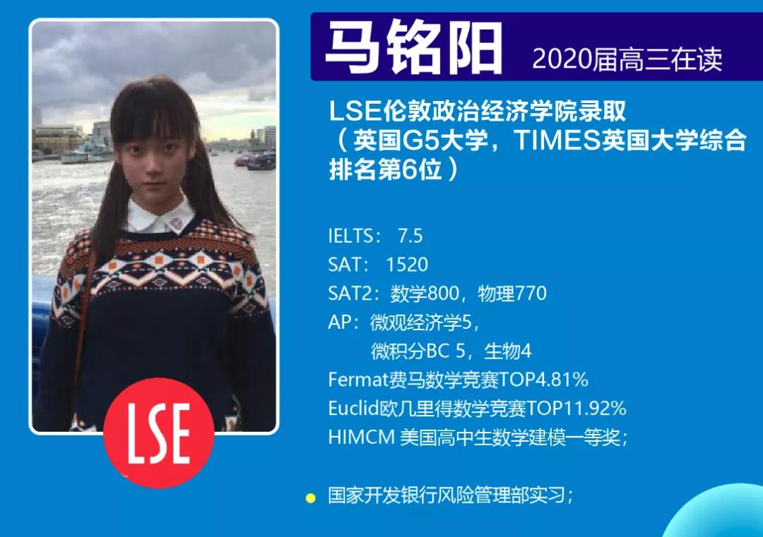 在今年的大学申请中,成都七中国际部高三AP学子马铭阳,被英国伦敦政治经济学院、爱丁堡大学、伦敦国王学院以及加拿大多伦多大学、滑铁卢大学5所世界一流名校同时录取,最终,马同学选择了与牛津、剑桥并称为金三角名校和G5超级精英大学的伦敦政治经济学院。这样的结果并不让人意外,因为在国际部的3年里,她所走的每一步都是经过认真规划的。对自我清晰的认知,对学习极其的专注和热爱,这些都是国际部学子能收割世界名校OFFER一致的法宝。