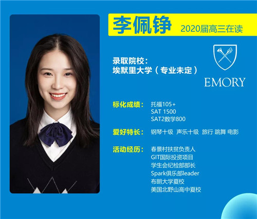 在七中国际部,学术成绩好且多才多艺学生很多,但是他们各自又有不同的个性品质。而毛慧老师口中的这位“内外兼修”“才德兼备”的姑娘,此时已经拿到了号称“南部哈佛”,美国排名21位的埃默里大学录取,当问到对未来的期盼时,她很淡然的回答到:“毕竟山外有山人外有人,在大学还要不断提升自己,不能放松,拿到满意的GPA去挑战更顶级的研究生院校。”