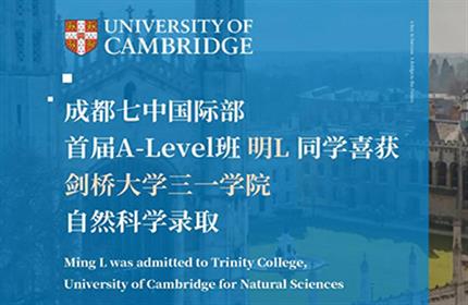 1月25日,剑桥大学放榜,成都七中国际部明L同学凭借优异的A-Level成绩和完美的面试表现获得英国剑桥大学三一学院自然科学专业录取。这是继我校8枚英国G5名校录取后的又一份重磅录取!